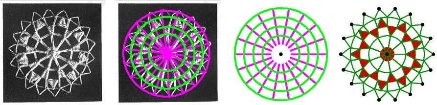 Quelle que soit la forme du motif, les fils doivent être également espacés pour que la dentelle soit belle. Les épingles doivent donc être placées à l’intersection des rayons tracés depuis le centre et du bord. Les positions des épingles au bord des motifs non circulaires ne sont pas régulières, d’où la nécessité des papiers gradués pour créer des motifs.