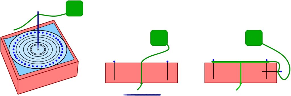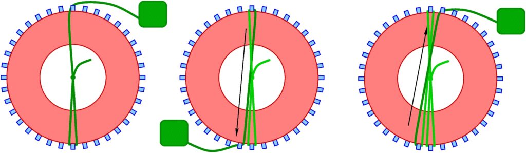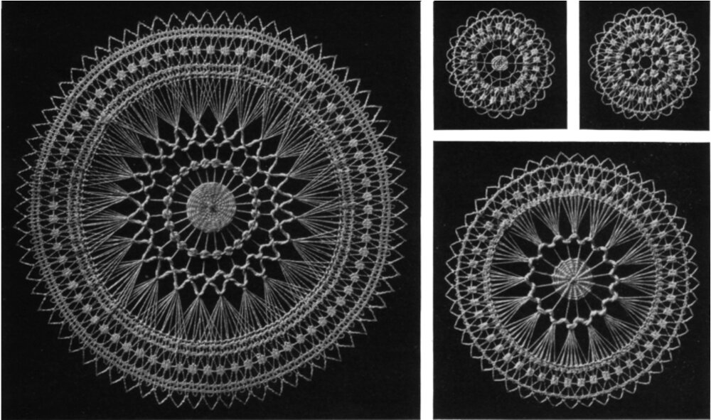 Dans les deux cas, le long fil de réseau effectue des aller-retours entre points diamétralement opposés, de façon à former environ 120 à 150 rayons par cercle – c’est-à-dire, entre 30 et 40 allers-retours sur le diamètre.