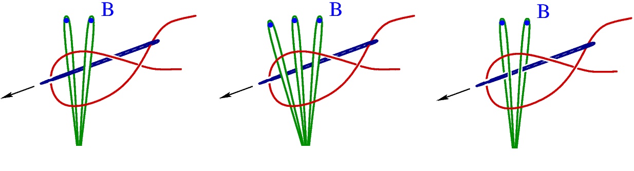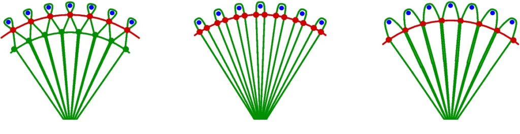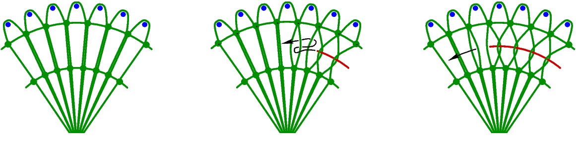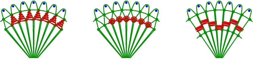 À gauche, la disposition des fils est inchangée. Au milieu, on obtient un faisceau unique provenant du centre, qui se sépare au-dessus du nœud en 3 branches. À droite, les fils sont séparés de sorte à donner le bord dentelé typique en dentelle Ténériffe, représenté dans le schéma de droite des bords (ci-dessous).