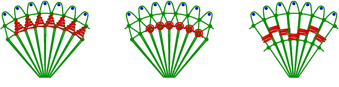 Les triangles nécessitent un espace triangulaire entre deux lignes de nœuds consécutives. Les roues, ou rosettes, sont formées en recouvrant des nœuds ayant un nombre impair de rayons (ici, 5 rayons). Les carrés ou rectangles sont réalisés dans des espaces rectangulaires, et ils ne sont pas nécessairement ancrés dans une ligne de nœuds : ils peuvent être décalés pour former des frises.