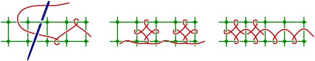L’aiguille sort de bas en haut entre les fils de la paire 1. Elle passe au-dessus du second fil de la paire 1 et du premier fil de la paire 2 et plonge de haut en bas entre les fils de la paire 2. Elle sort en arrière, entre les paires 1 et 2, puis plonge de haut en bas entre les fils de la paire 1. Elle repart vers l’avant en sortant de bas en haut entre les fils de la paire 2. L’entrelac se forme en tendant le fil.