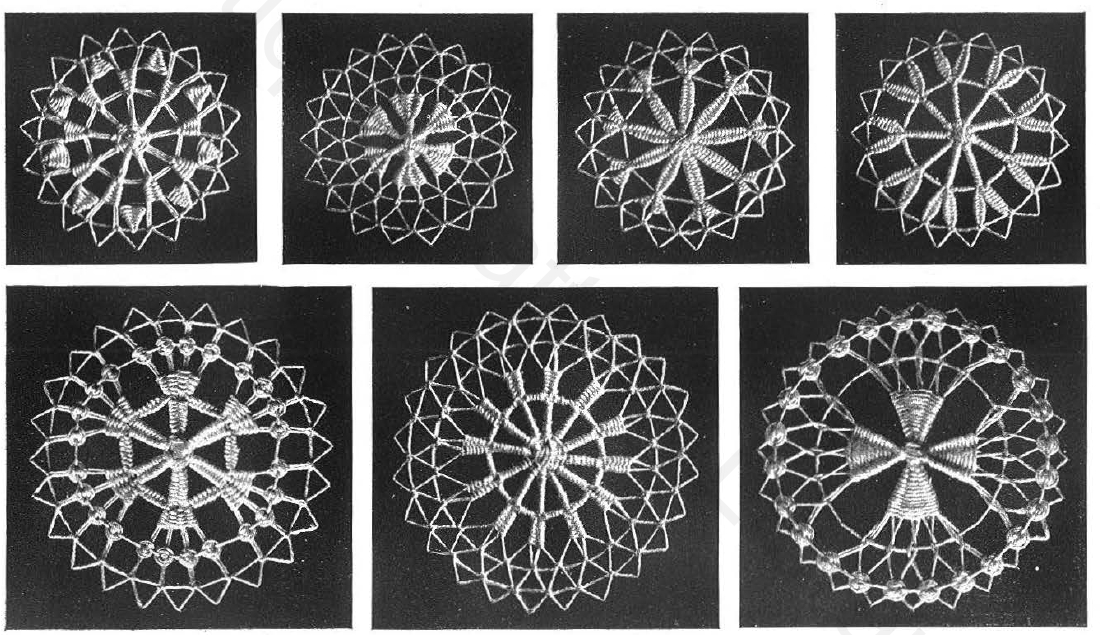 En appuyant fermement avec le pouce sur le centre du réseau, on libère l’épingle latérale et on passe l’aiguille dessus-dessous chaque paire de fil attachée à une épingle, en alternant au rang suivant. En serrant, la roue se forme au centre du réseau. Pour passer à l’ornementation, on quitte au dernier rang après avoir piqué dans le rang précédent.