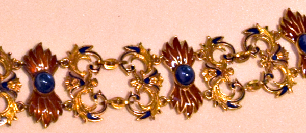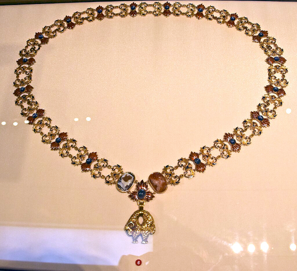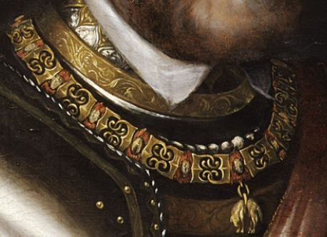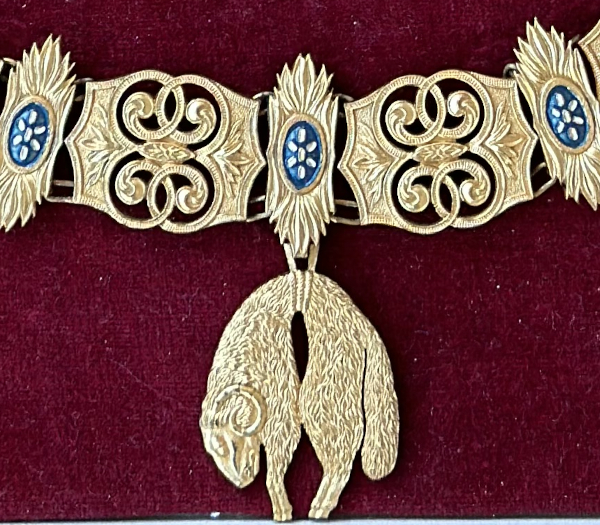 Le pendentif représente la célèbre Toison d’or, c’est-à-dire la toison d’un bélier divin, volée par Jason et les Argonautes au roi de Colchide, sur la côte orientale de la Mer noire. Le collier lui-même présente une alternance de « fusils » imbriqués par deux et de « pierres à feu ».