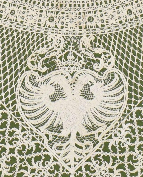 Les motifs de feuillages de la bordure et de la rosace permettent de dater les nappes entre 1600 et 1650, époque où les dentelles possèdent encore les « dents » qui leur ont donné leur nom. Quant aux symboles employés, ils marquent comme destinataire un souverain de la maison des Habsbourg.