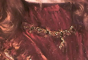 On reconnait bien le pendentif, ainsi que les pierres à feu entourées de pointes qui représentent les étincelles. La forme des briquets en B enlacés est un peu moins lisible. La Toison d’or est suspendu à une paire de briquets, contrairement aux colliers réels où elle est suspendue à une pierre à feu.