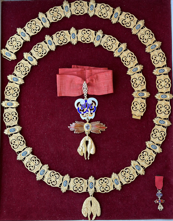 - le collier de l’Ordre de la Toison d’or entourant la rosace (en vert),